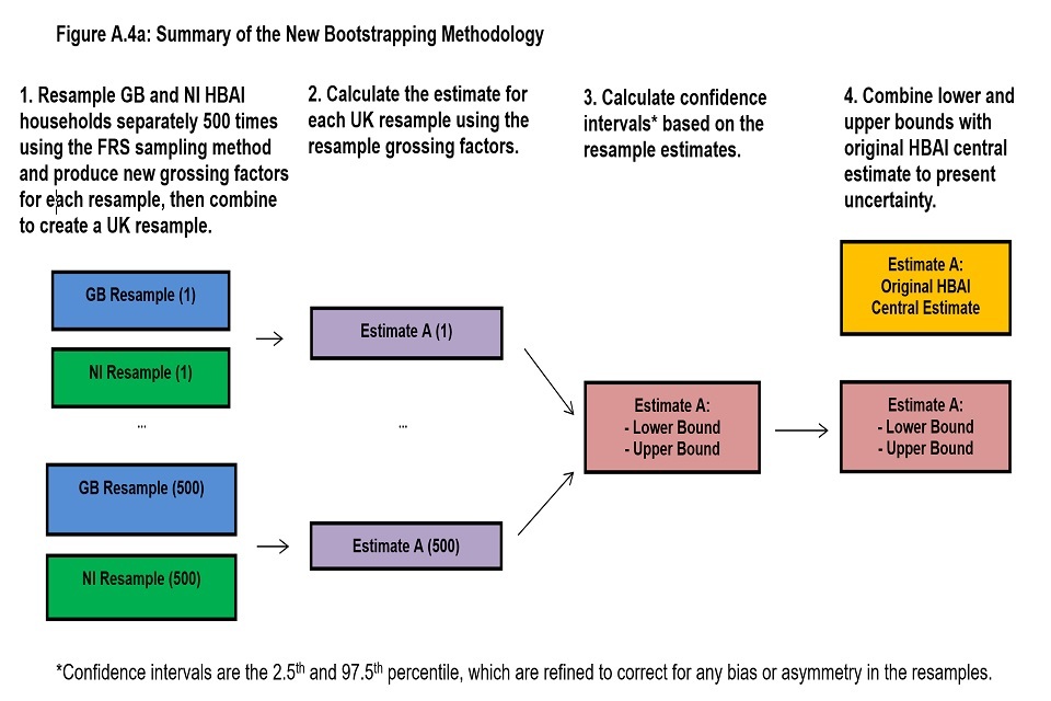 As the FRS is a sample from the UK population, any statistics derived from it are only estimates of the true numbers for the overall population. Prior to the FYE 2013 publication, confidence intervals for HBAI estimates were calculated using an estimating function approach. Since then, DWP has used bootstrapping techniques to measure how different a HBAI estimate might have looked if different FRS samples had been drawn.