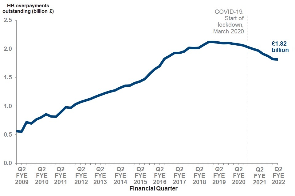 As a result, the total amount of outstanding HB overpayments has fallen, from a peak of £2.12 billion million at the start of Q4 of FYE 2018 to £1.82 billion at the start of Q2 of FYE 2022.
