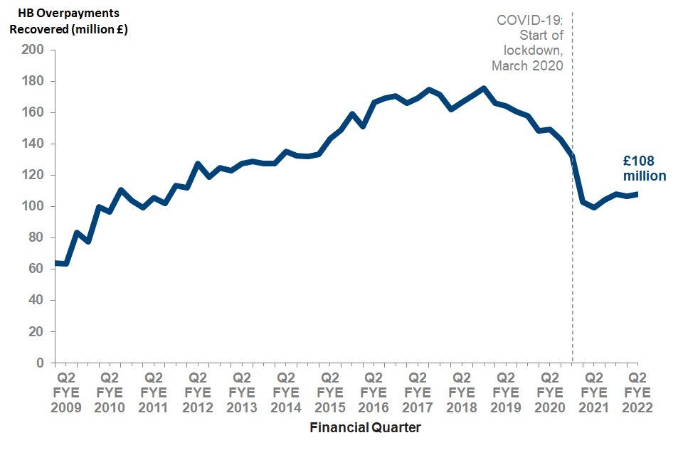 In Q3 of FYE 2021, the amount of HB overpayment recovered by LAs fell below £100 million for the first time since 2010.