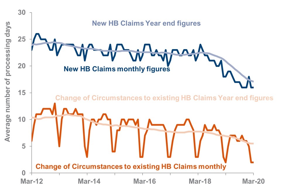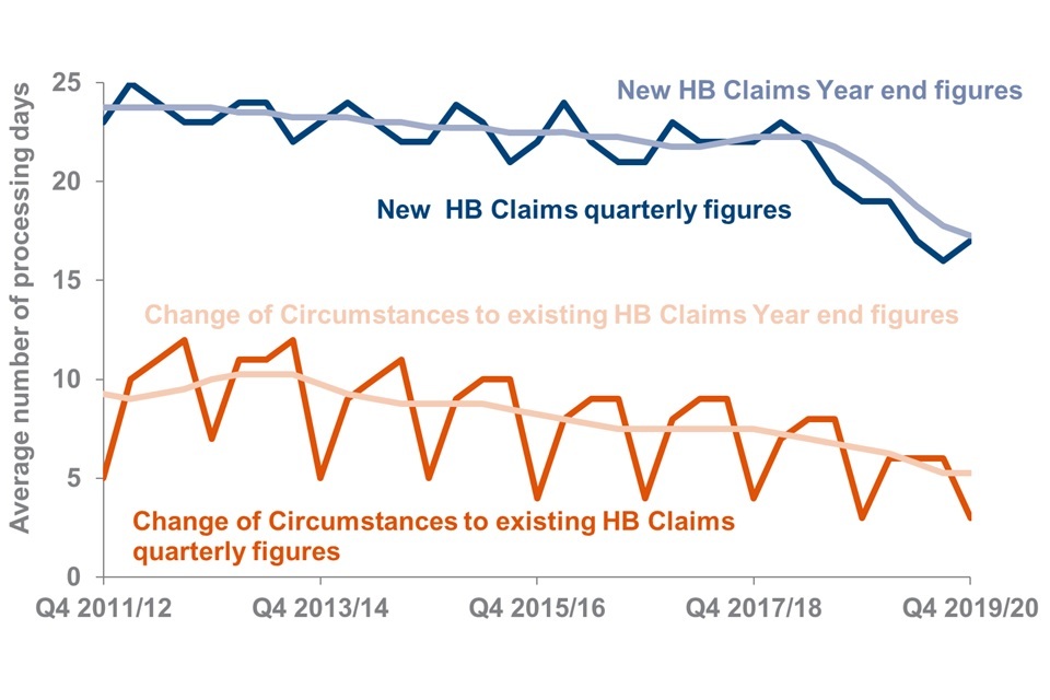 the average time taken to process a New HB Claim during quarter 4 of the financial year 2019 to 2020 was 17 calendar days – this is 2 days lower than in the same quarter of 2018 to 2019 and the lowest it has been for that quarter
