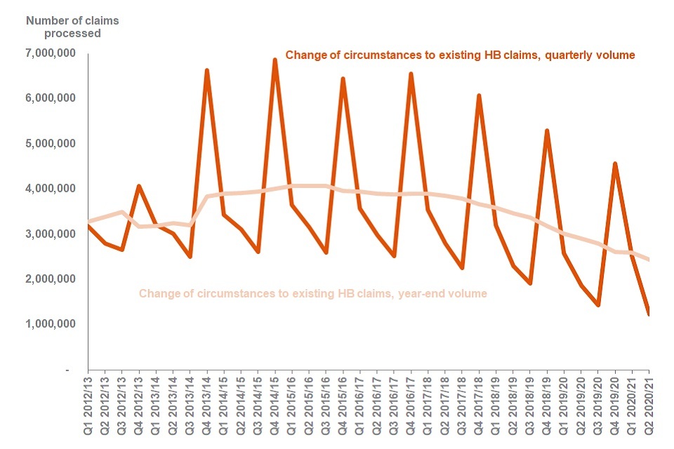 Year-end figures initially showed an increase in the volume of change of circumstances to existing HB claims however, since quarter 2 2015 to 2016 (4.1 million) this volume has followed a continuing downward trend to 2.4 million at quarter 2 2020 to 2021.