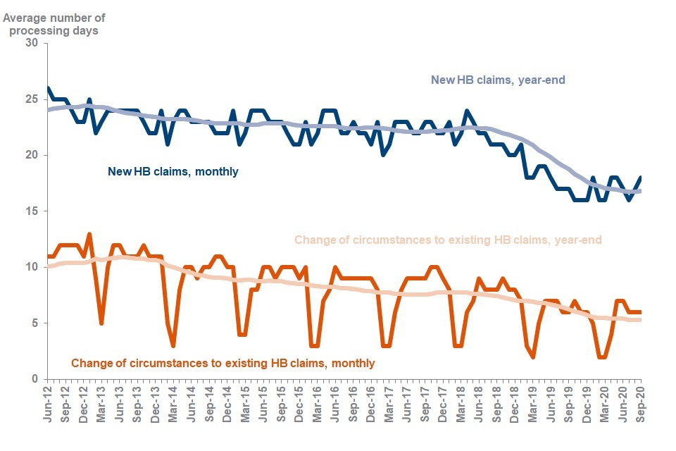 Variations between the average number of days that each LA takes to process a new HB claim or a change of circumstance to an existing HB claim should be seen in context with changes to operational processes, including reallocating resource due to impacts of the COVID-19 pandemic.