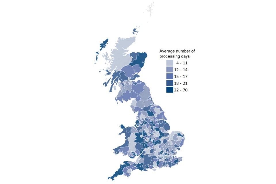 The quarterly average number of days to process change of circumstances to existing HB claims at the LA level ranged from 1 calendar day to 78 calendar days during quarter 2 2020 to 2021. 90% (339) LAs had a quarterly average number of days to process change of circumstances to existing HB claims of 1 to 9 calendar days while the remaining 10% (38) LAs took on average between 10 and 78 calendar days to process change of circumstances to existing HB claims during the quarter. Of these LAs, one had a quarterly average of 78 days to process change of circumstances to existing HB claims, the remainder had a quarterly average of 21 days or fewer to process change of circumstances to existing HB claims.