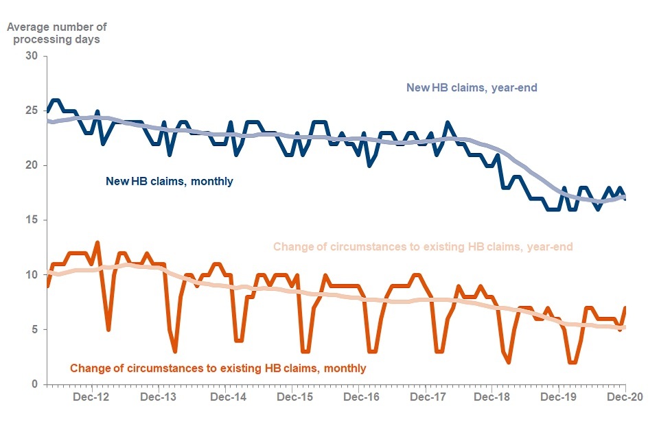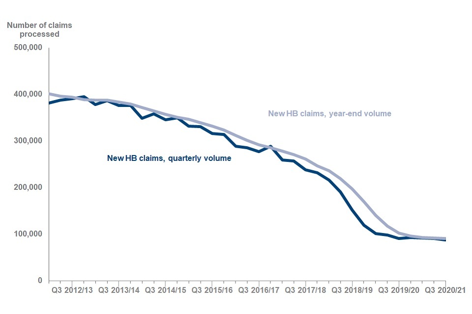 Year-end figures peaked for new HB claims in quarter 1 2012 to 2013, with an average of 24 calendar days to process and continued to steadily decrease until quarter 4 2018 to 2019 with an average of 21 calendar days to process. Since then, the average number of calendar days to process has decreased more quickly to an average of 17 calendar days to process a new HB claim in quarter 4 2019 to 2020, where it has remained to quarter 3 2020 to 2021. This is due to the impact of the roll out of UC, as fewer people are now able to open a new HB claim. Read about who can get HB.