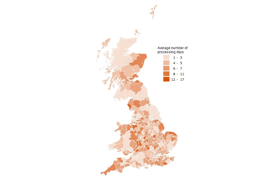 at the Local Authority (LA) level, LAs took between 5 and 42 days on average, to process new HB claims during quarter 3 2020 to 2021 and took between 1 and 17 days on average to process a change of circumstance to an existing HB claim during quarter 3 2020 to 2021