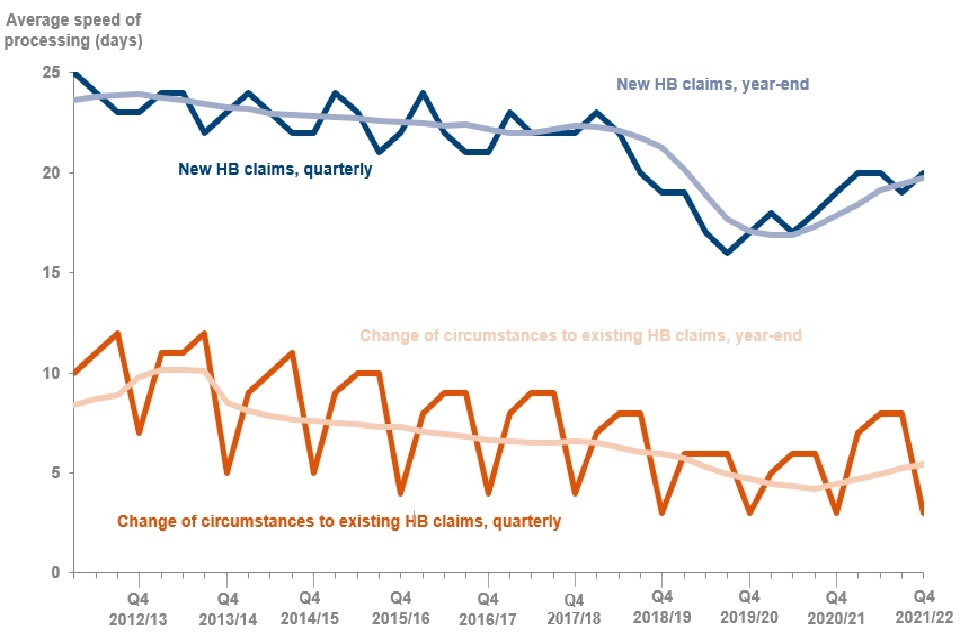 the average speed of processing for change of circumstances to an existing HB claim is 3 calendar days in the latest quarter, which is five days lower than last quarter and the same as quarter 4 2020 to 2021. Rolling average year-end figures show a slight increasing trend over the last 15 months