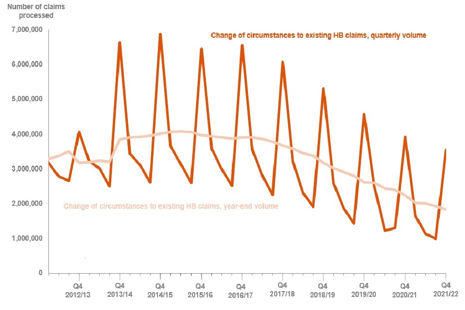 It is useful to note that in quarter 4 each year, the volume of change of circumstances to existing HB claims increases sharply, due to the end of the financial year before the uprating of rent. This quarter continues that trend showing a 257% increase in the volume of change of circumstances to existing HB claims compared to quarter 3 2021 to 2022 (1.0 million).