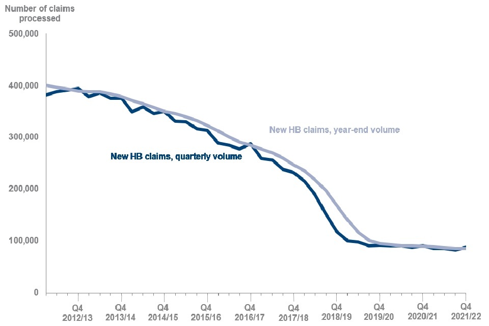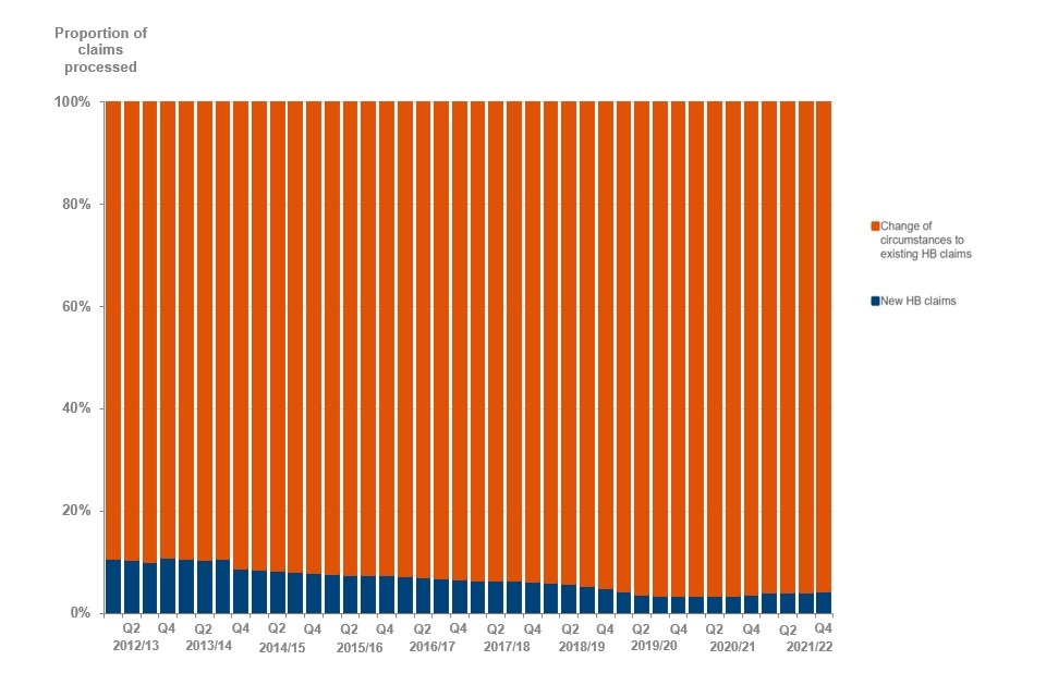 During the latest quarter there were 88,000 (2%) new HB claims and 3.6 million (98%) change of circumstances to existing HB claims processed in GB. This compares to 91,000 (2%) new HB claims and 3.9 million (98%) change of circumstances to existing HB claims at the same quarter a year earlier.