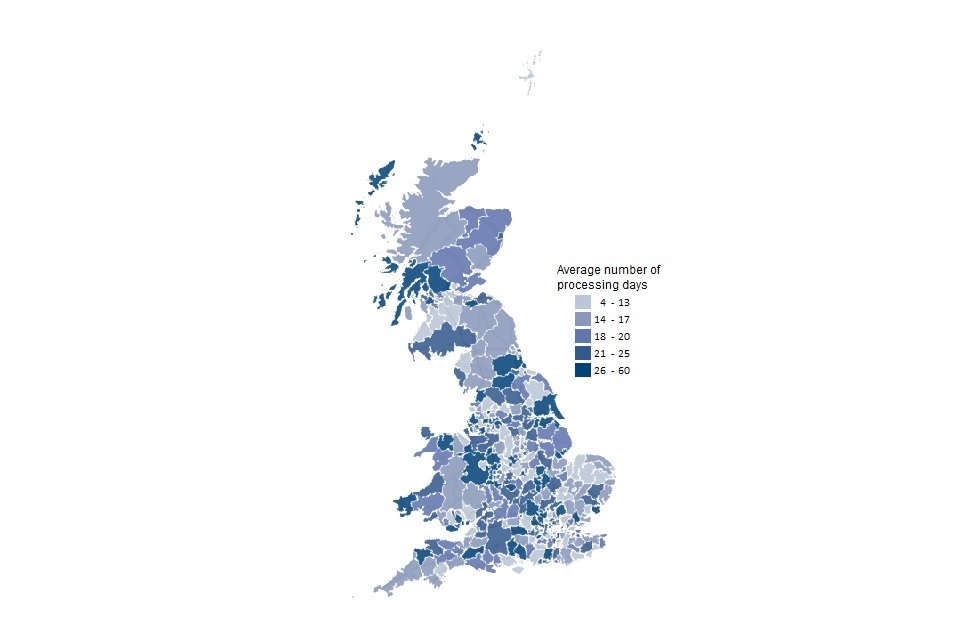 Quarterly average number of days to process new HB claims and change of circumstances to existing HB claims can be illustrated at the LA level for GB. For a more detailed breakdown see table 1 of the data tables accompanying this release of statistics.