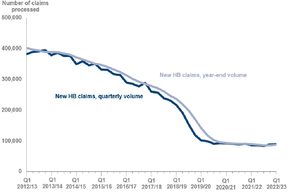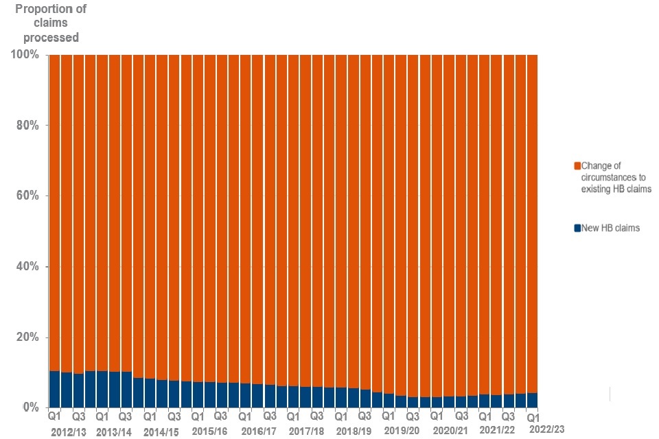 During the latest quarter there were 89,000 (6%) new HB claims and 1.4 million (94%) change of circumstances to existing HB claims processed in GB. This compares to 86,000 (5%) new HB claims and 1.6 million (95%) change of circumstances to existing HB claims at the same quarter a year earlier.