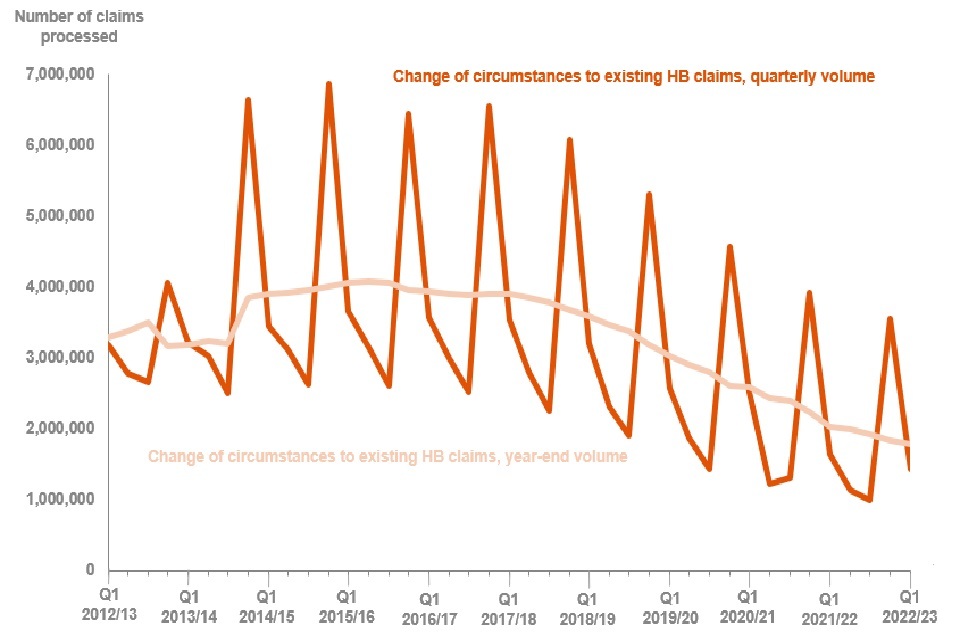 It is useful to note that in quarter 4 each year, the volume of change of circumstances to existing HB claims increases sharply, due to the end of the financial year before the uprating of rent. There is then a steep drop in the volume to quarter 1. This quarter continues that trend showing a 59% decrease in the volume of change of circumstances to existing HB claims compared to quarter 4 2021 to 2022 (3.6 million).