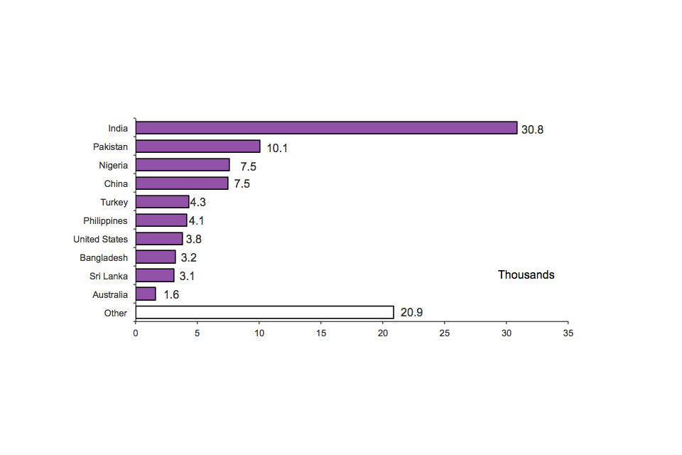 Top 10 non-EEA nationalities granted visas for work, year 2011 (Total 149,221).