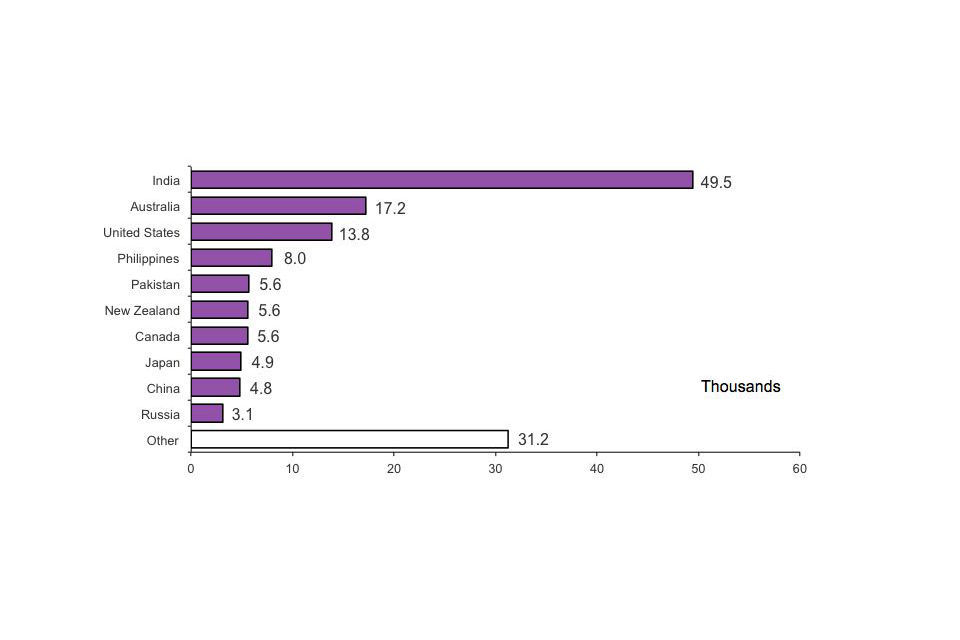 For work-related visas and admissions the highest numbers relate to Indian, USA and Australian nationals. The top 10 nationalities are the same, apart from a difference in the tenth place (Nigeria is tenth for admissions), though the order differs.
