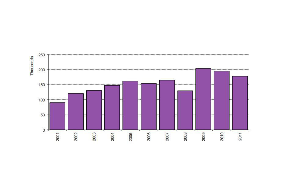 SAWS approvals rose from 8,058 in 2007 to an annual average of just over 20,000 for 2009 to 2011. There were 10,103 SAWS approvals in the first quarter of 2012, (falling to 7,952 in the second quarter 2012), the second highest quarterly total recorded