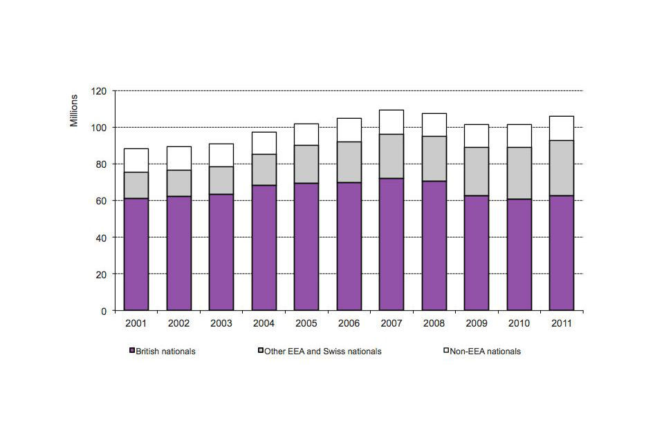 Between 2000 and 2003, the number of EEA passenger arrivals was relatively stable; however, there was an increase in 2004, which coincided with ten countries joining the EU / EEA. The number of EEA passenger arrivals rose from 17.0 million in 2004 to 29.8 million in 2011. These numbers will, additionally, have been boosted by nationals of Bulgaria and Romania, following these countries becoming part of the EEA in 2007.