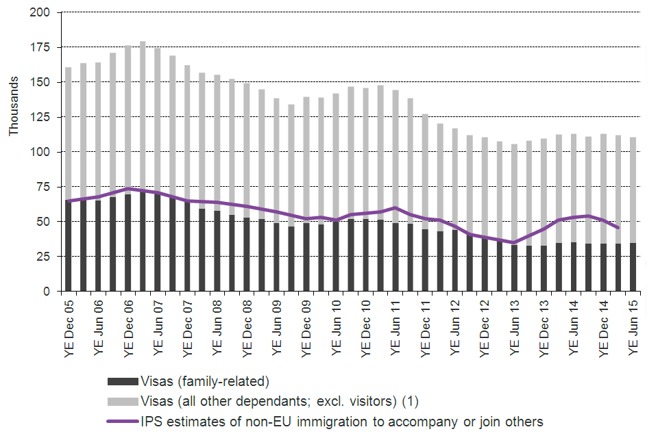 Source: This table is based on data from Family tables fa 02 and Visas table vi 06 q f in the Home Office, Immigration Statistics April to June 2015 release.