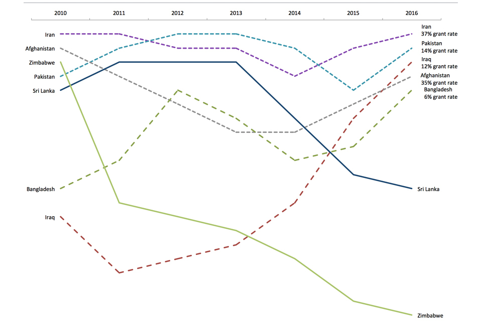 Three of the top 5 nationalities applying for asylum in 2010 were still present in the top 5 in 2016 (Afghanistan, Iran and Pakistan). Zimbabwe was ranked third for asylum applications in 2010, but fell to 21st in 2016. Iraq is now ranked third for asylum applications, up from the series low of 18th in 2011.