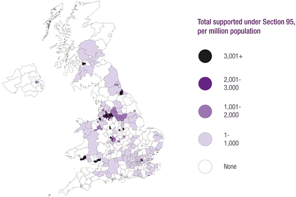 People in receipt of Section 95 support, by local authority, per million population, as at the end of 2016