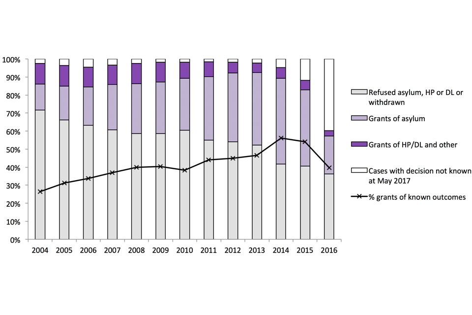 The chart shows the outcome of asylum applications made between 2004 and the latest calendar year as at May 2017. The data are available in Table as 06.