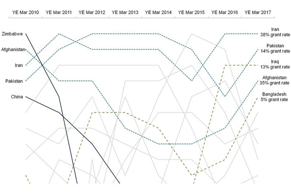 Three of the top 5 nationalities applying for asylum in the year ending March 2010 were still present in the top 5 in the year ending March 2017 (Afghanistan, Iran and Pakistan). Zimbabwe was ranked first for asylum applications in the year ending March 2010, but fell to 21st in the year ending March 2017. Iraq is now ranked third for asylum applications, up from the series low of 18th in the years ending March 2012 and 2013.
