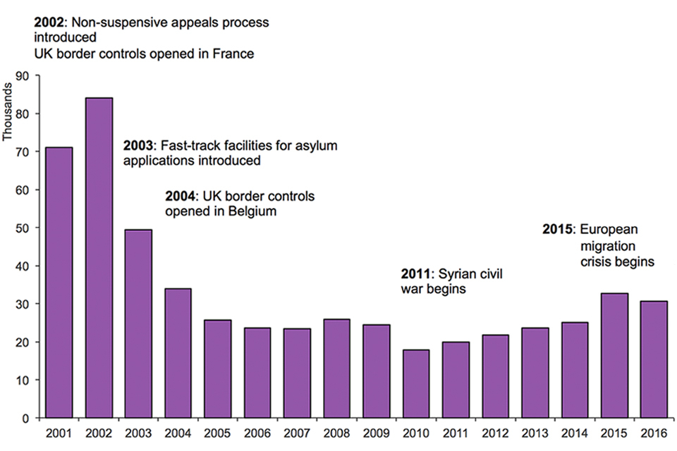 The chart below shows the annual number of asylum applications made since 2001.