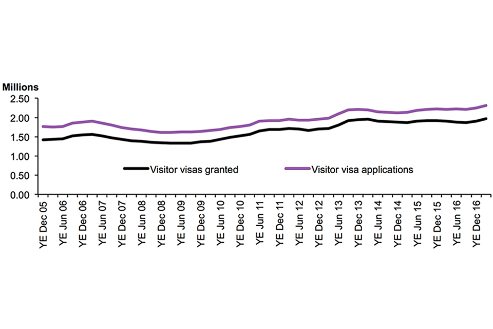 Source: Home Office, Immigration Statistics January to March 2017. Statistics on Visitor visas applications and Visitor visas granted in the year ending March 2017 can be found in Visas table vi 01 q (Visas volume 1). The number of visitor arrivals for 2016, by nationality, will be published in August 2017.
