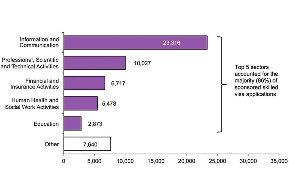 The chart shows the sponsored visa applications by industry sector for the year ending March 2017. The data are sourced from the Sponsorship tables. The top 5 sectors accounted for the large majority (86%) of sponsored Skilled work visa applications.
