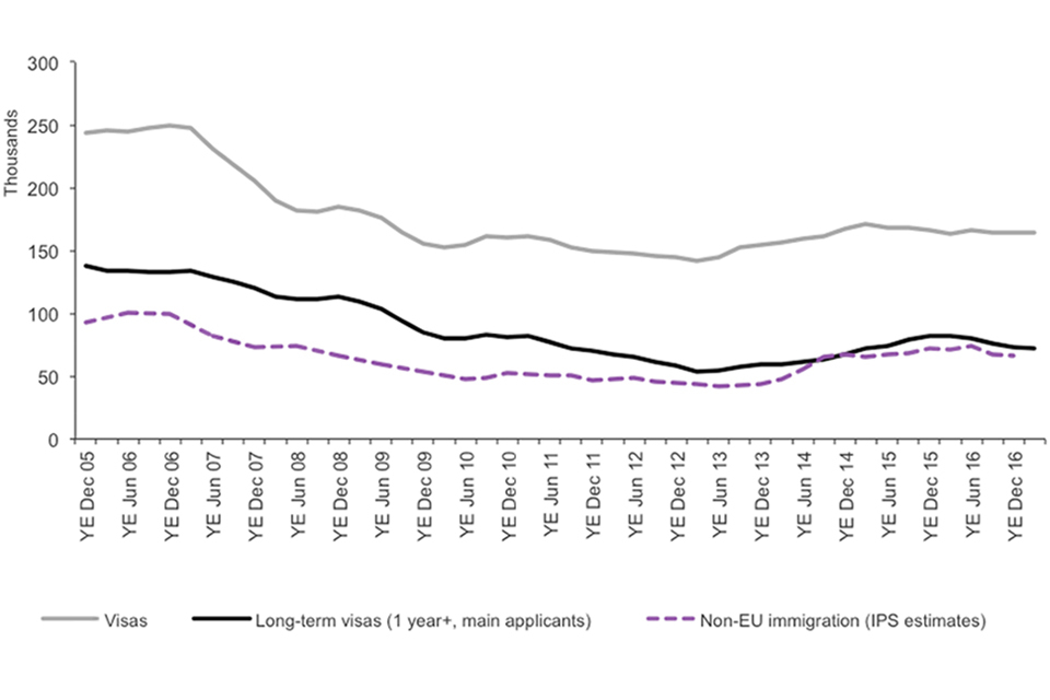 Source: Home Office, Immigration Statistics January to March 2017, Visas table vi 04_q (Visas volume 1), International Passenger Survey (IPS), ONS Migration Statistics Quarterly Report.