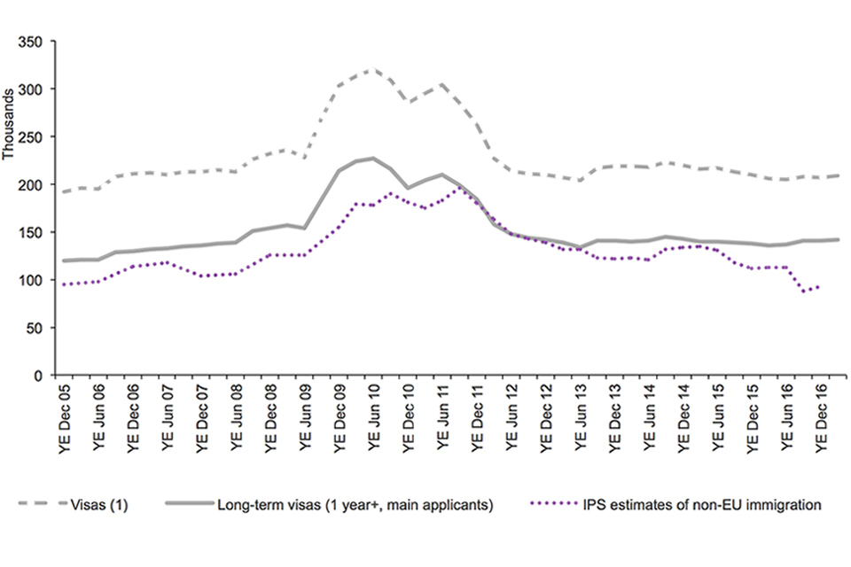 Source: Home Office, Immigration Statistics January to March 2017, Visas table vi 04 q, Visas volume 1 and Visas table vi 06 q s, Visas volume 3,, International Passenger Survey (IPS); ONS Migration Statistics Quarterly Report.