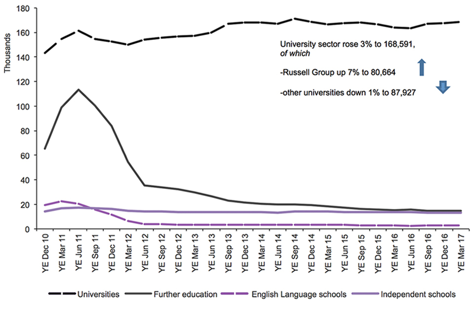Source: Home Office, Immigration Statistics January to March 2017, Visas tables vi 04 q, Visas volume 1 and corresponding datasets; ONS Migration Statistics Quarterly Report.