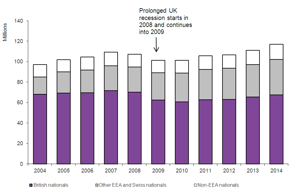 The chart shows the total number of journeys made into the UK by broad nationality between 2004 and the latest calendar year available. Prolonged UK recession starts in 2008 and continues into 2009. The data are available in Table ad 01.