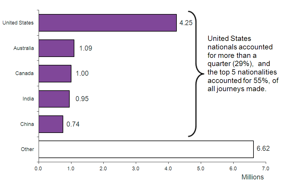 Total passenger admissions data are available up to the year ending September 2015; data on the purpose of journey (e.g. visit, work, study) and for individual nationalities are available up to the end of 2014.