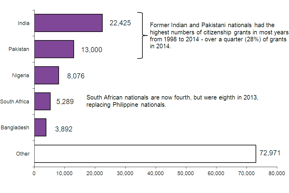 The chart shows grants of citizenship by previous nationality in 2014. Former Indian and Pakistani nationals had the highest numbers of citizenship grants in most years from 1998 to 2014 - over a quarter (28%) of grants in 2014.