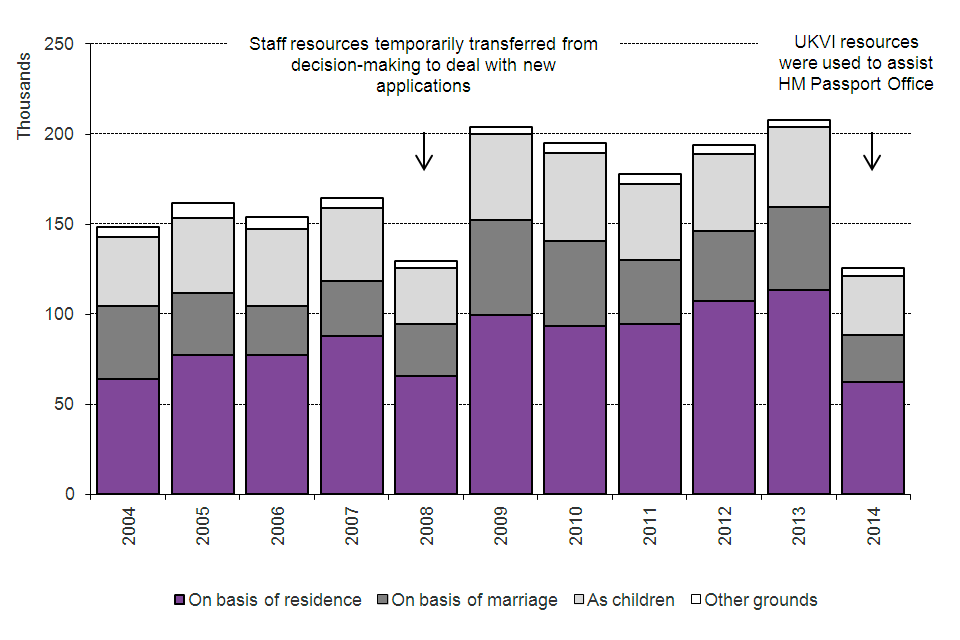 The chart shows the number of grants of British citizenship between 2004 and the latest calendar year. In 2008 staff resources were temporarily transferred from decision-making to deal with new applications.