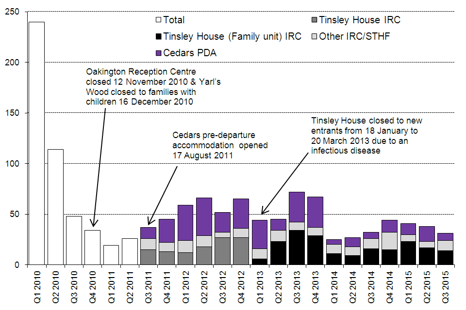 In the third quarter of 2015, 31 children entered detention, compared with 32 in the third quarter of 2014 and 72 in the third quarter of 2013. Of the 31 children, 14 were initially detained at Tinsley House (Family Unit) immigration removal centre (IRC), 7 at Cedars pre-departure accommodation (PDA) and 10 at other IRCs and short-term holding facilities (STHFs).