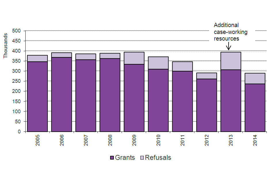 The chart below illustrates longer-term trends in grants and refusals to extend stay by calendar year.