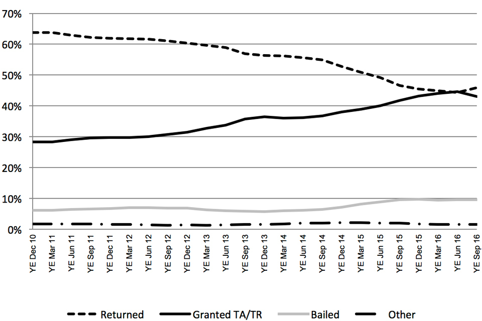 The decline in the proportion of detainees being returned or voluntarily departing the UK on leaving detention has slowed and slightly reversed as compared to the previous quarterly figure but still remains lower, from the most recent peak in the year ending March 2011 of 64% to 46% in year ending September 2016. Conversely, over the same period, the proportion of detainees granted TA/TR increased from 28% to 43%, and the proportion of detainees granted bail increased from 6% to 10%.