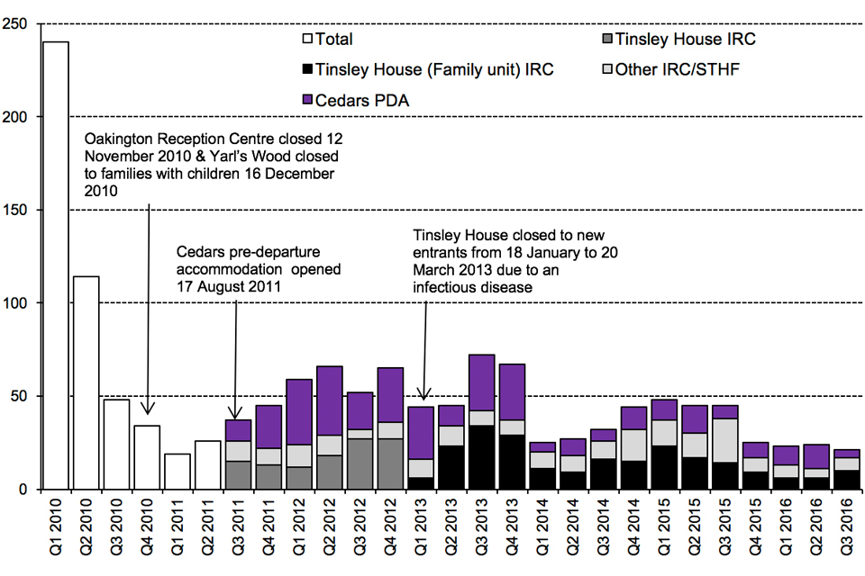 From the third quarter of 2011, all child detainees in Tinsley House are shown in Tinsley House IRC. From January 2013 child detainees in Tinsley House IRC, as part of a family, are shown in Tinsley House (Family Unit) IRC; the remainder are shown in Other IRC/STHF (short-term holding facilities).