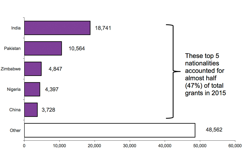 Of the total 90,839 grants of permission to stay permanently in 2015, over two-fifths (41% or 37,107) were to nationals of South Asia and nearly a quarter (23% or 20,927) were to nationals of Sub-Saharan Africa.