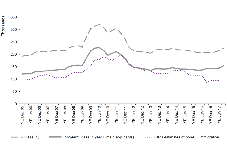 Source: Home Office, Immigration Statistics July to September 2017, Visas tables vi 04 q (volume 1) and Visas tables vi 06 q s (volume 3), International Passenger Survey, Office for National Statistics, Migration Statistics Quarterly Report Statistical bulletins.