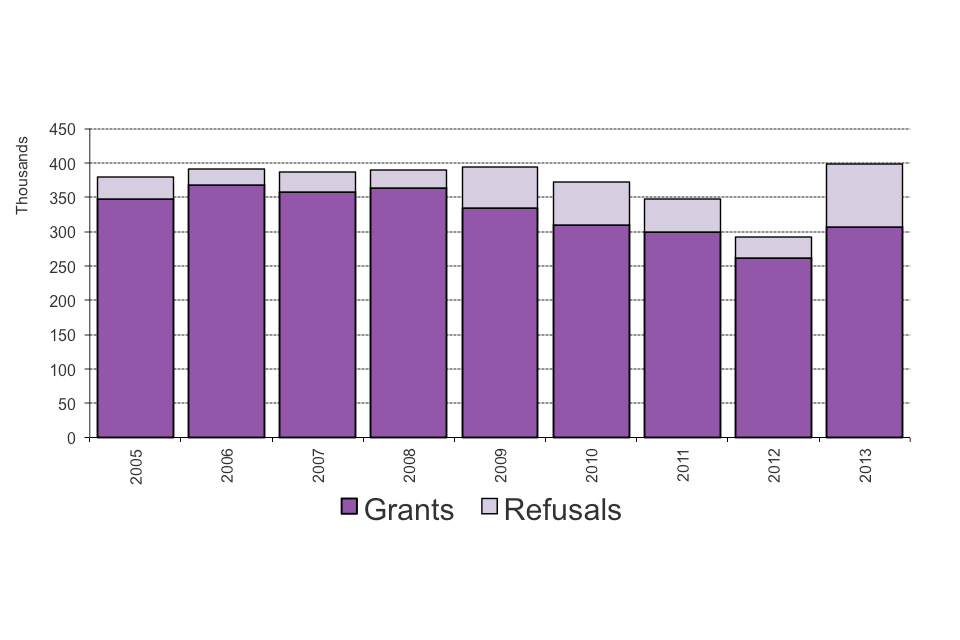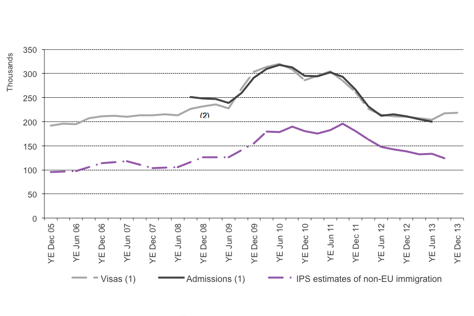 Source: Home Office, Immigration Statistics October to December 2013, Before entry table be 04, International Passenger Survey, Migration, Office for National Statistics.