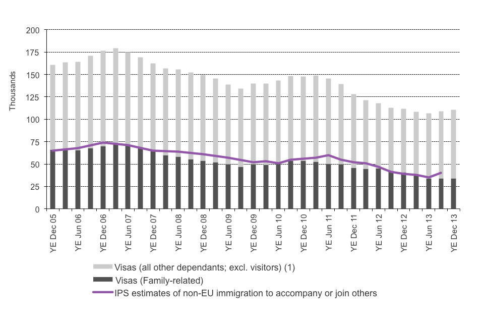 The IPS, run by the Office for National Statistics (ONS), also provides estimates for the number of people immigrating to the UK who state that the main reason is to accompany or join someone else, including family members, and have the intention of staying for a year or more.