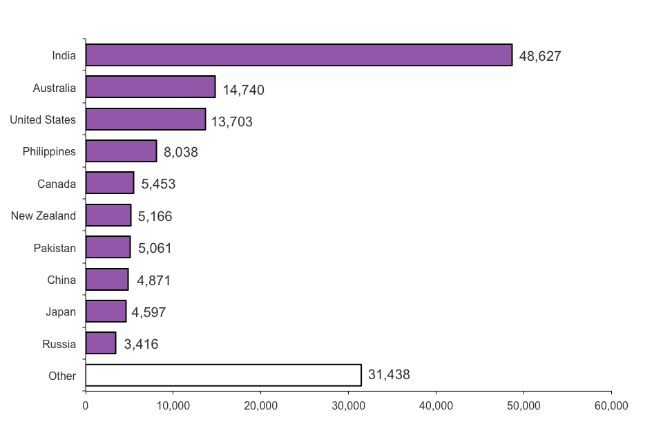 For both work-related visas and admissions, the highest numbers relate to Indian, Australian and United States nationals. In 2012, the top 10 nationalities (see chart below) were the same for both series, apart from a difference in the order. Some of the differences in the ranking between visas and admissions data for 2012 may be due to timing differences, for example, some visas granted in 2012 may be used in 2013. Additionally, some individuals admitted within the creative and sporting category (part of Tier 5) do not need a visa, and this largely explains the higher number of admissions (estimated at 26,700) of United States nationals compared to numbers issued with a visa (13,703).