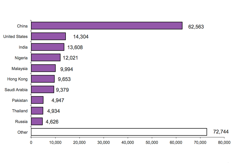 For 2012 data, the nationality breakdown for those granted extensions for work (see chart below) is in some respects different from the top 10 nationality rankings for admissions and for visas. Nigerian, Bangladeshis, Turkish and Sri Lankan nationals accounted for the fourth, seventh, eighth and tenth highest number of extensions for work.