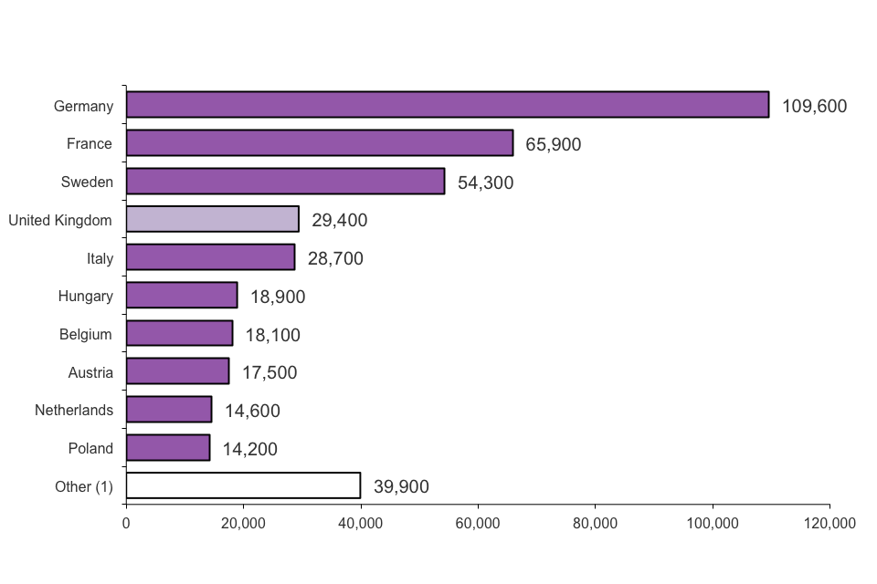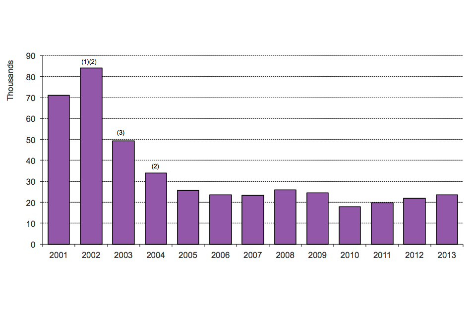 There was an 8% increase in asylum applications in 2013 (23,507) compared with 2012 (21,843), although well below the peak number of applications in 2002 (84,132). The increase in 2013 was particularly driven by rises from Syria (+681), Eritrea (+649) and Albania (+507). While Syria saw the largest increase in applications, it remains fourth for overall numbers of asylum applications.