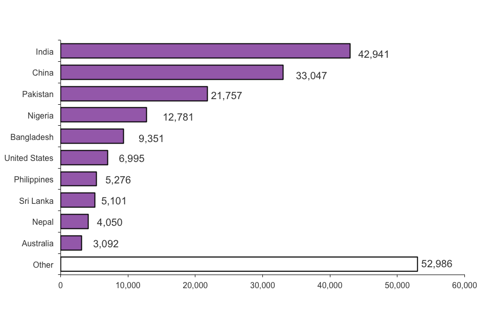 The main explanation for the difference in the nationality breakdowns compared with work-related admissions and visas is that over half of the grants to Nigerian, Bangladeshi and Sri Lankan nationals were grants as high value individuals under the (Tier 1) Post-Study route. Since they originally entered via a study route, they are not prominent in the nationality rankings for work-related admissions and visas. Turkish nationals also have special provision to switch into the ‘work route’ under the European Community Association Agreement with Turkey.