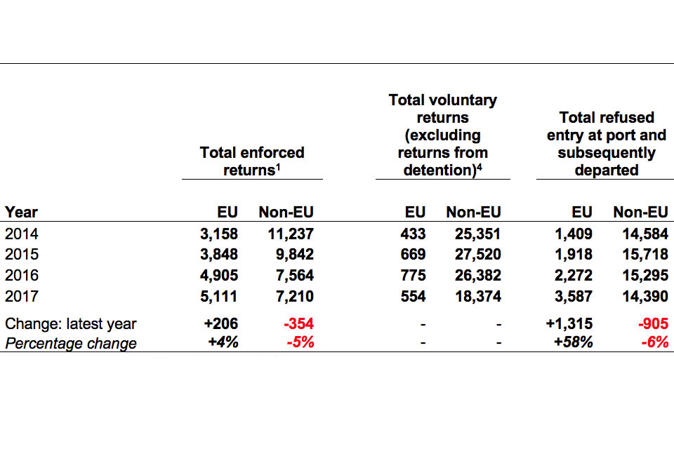 The number of EU nationals who were returned, or voluntarily departed the UK on leaving detention, was 4,612 in 2017, compared with 4,048 in the previous year.