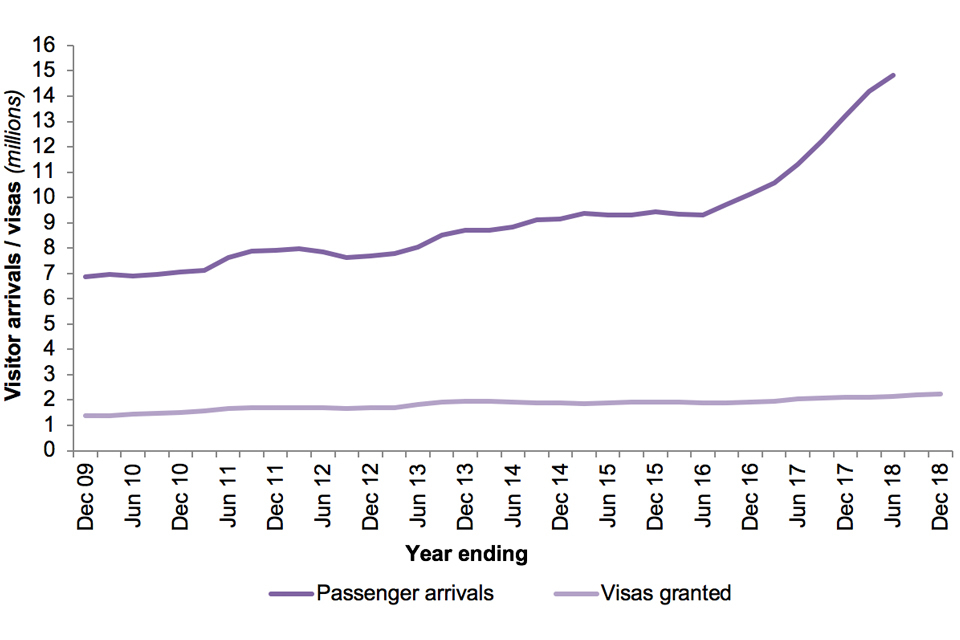 Figure 3: Visitor passenger arrivals and Visitor visas granted, 2009 to 20181
