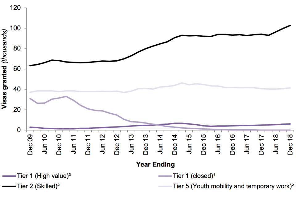 The total number of work-related visas granted (including dependants) in 2018 increased by 7% (or 11,183) to 176,126. This was primarily due to a 9% (or 8,488) increase Tier 2 (Skilled) work visas to 102,653. This category accounts for the majority (58%) of work-related visas granted.