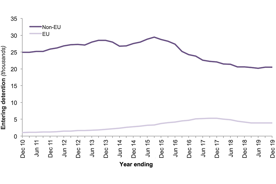 The majority (84%) of those entering detention in 2019 were non-EU nationals. The number of non-EU nationals entering detention fell from a peak of 29,424 in the year ending September 2015 to 20,578 in the year ending December 2018 and has remained stable over the latest year (20,501).